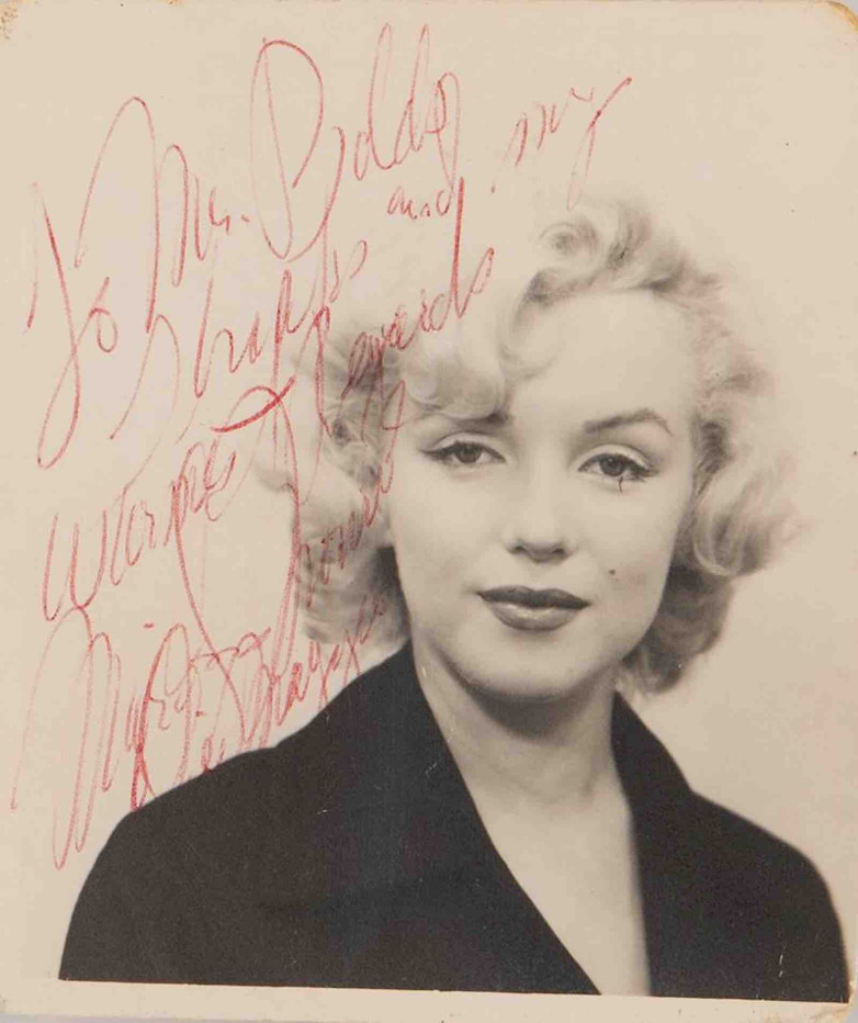 DiMaggio ran out to a Market Street arcade, returning with a batch of newly developed photos. One of those images, a vintage matte-finish photo measuring 2.25 x 2.75 inches, shows Monroe in a demure front-facing pose. She signed it in red ballpoint: “To Mr. Bolds, Thanks and my warmest regards, Marilyn Monroe DiMaggio.”