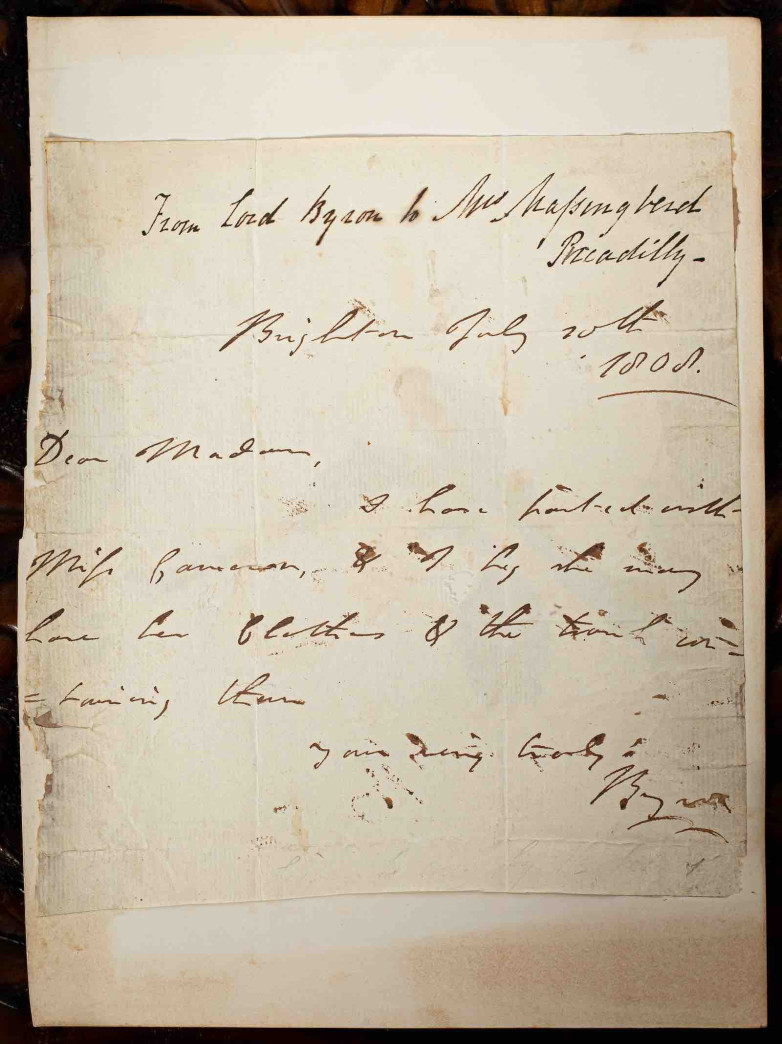 In contrast, the second letter (estimate: £3,000 – £5,000), dated July 20, 1808, from Brighton, announces the end of his affair with Caroline Cameron, a 16-year-old sex worker: “I have parted with Miss Cameron, and I beg she may have her clothes & the trunk containing them,” he writes.